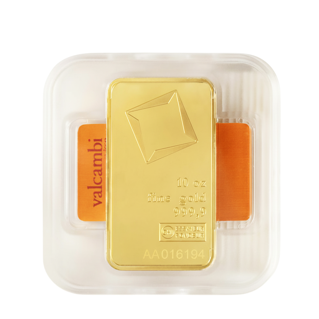 Invest in pure gold with the 10 oz Valcambi Gold Bar. With a weight of 10 Troy oz and a purity of .9999, this brand-new bar is an excellent investment option. Featuring engravings of purity, metal content, and weight on the obverse, and the Valcambi Suisse name on the reverse, this bar comes with an Assay card for authenticity. Add it to your precious metal portfolio now.